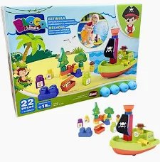 Contém: 6 pinos simples, 3 pinos duplos, 1 pino triplo, 1 pino quadruplo, 1 árvore, 1 pinheiro, 1 casco, 1 convés, 2 bonecos, 1 chassi, 1 vela, 1 canhão, 1 baú do tesouro e 1 vigia. Acompanha adesivos.